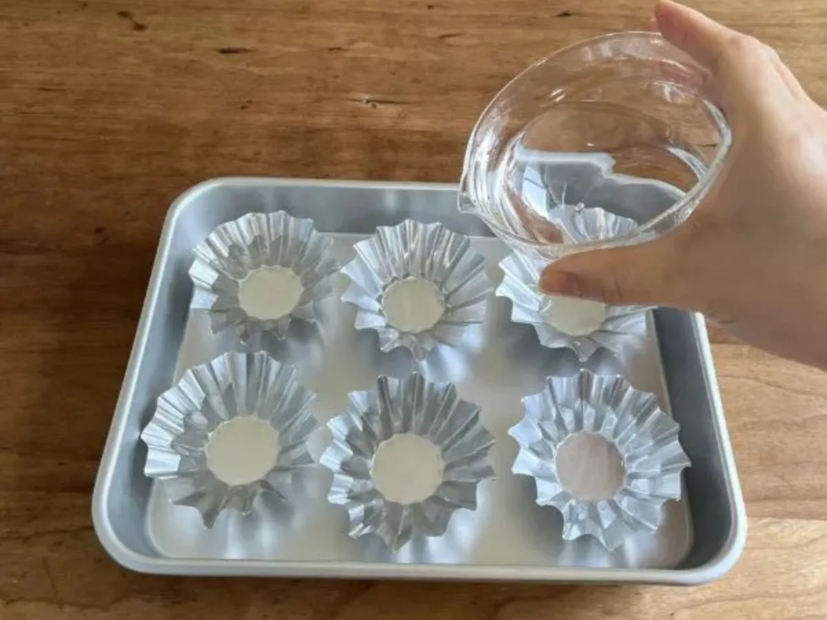 実は、水ではなくお湯を使うと、早く凍るのだとか。使うのは、アルミトレイ、アルミカップ、お湯です。