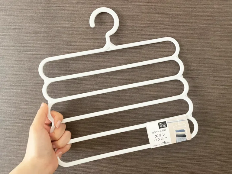 『ズボンハンガー』は税込み110円。サイズは縦が約30cm、横が約29.5cmで、ハンガーが5段になっており、ズボンを省スペースで収納することができる優れものです。