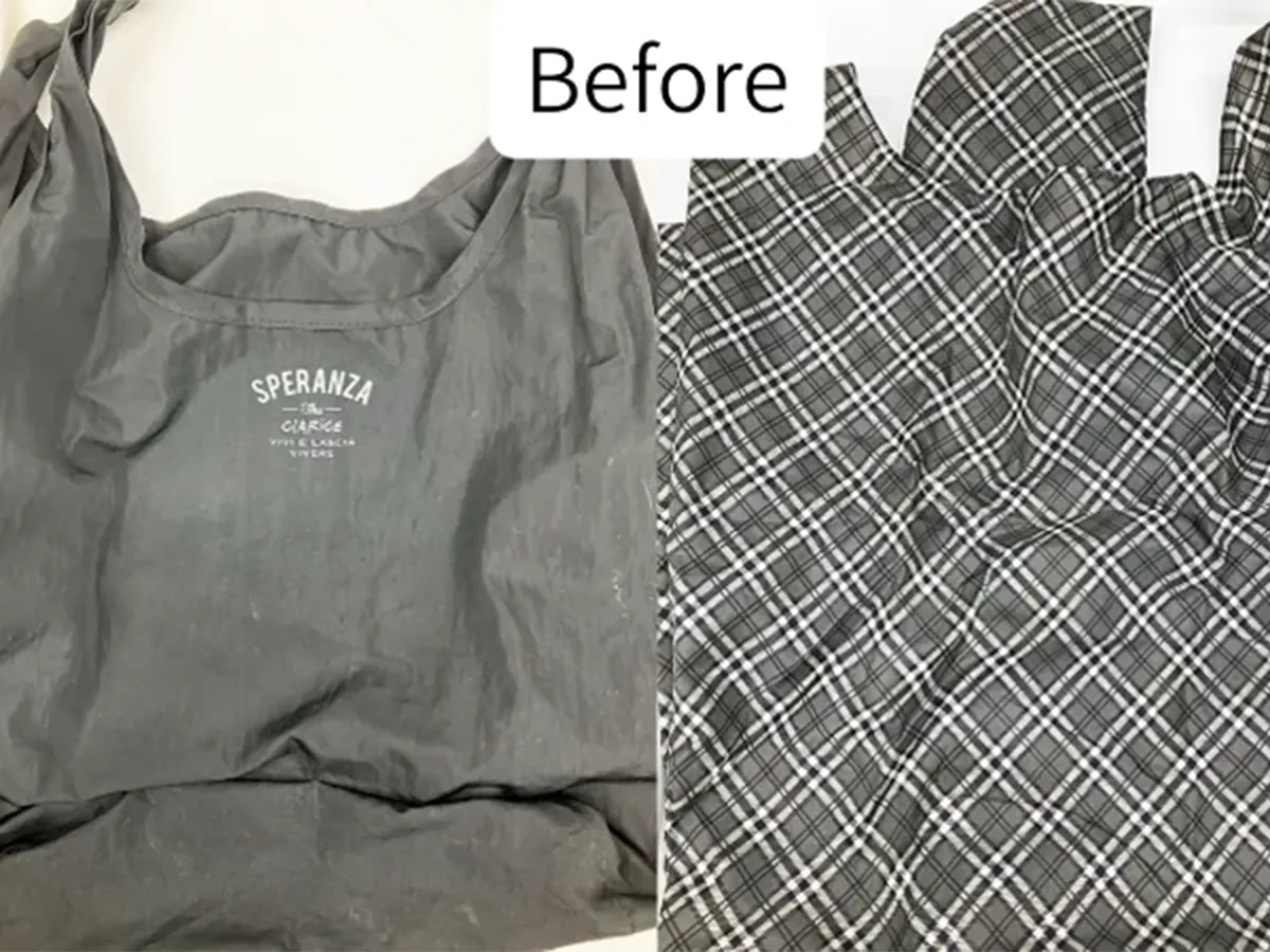 今回洗ったのは、黒いナイロン製のエコバッグと、チェック柄のエコバッグの2つ。