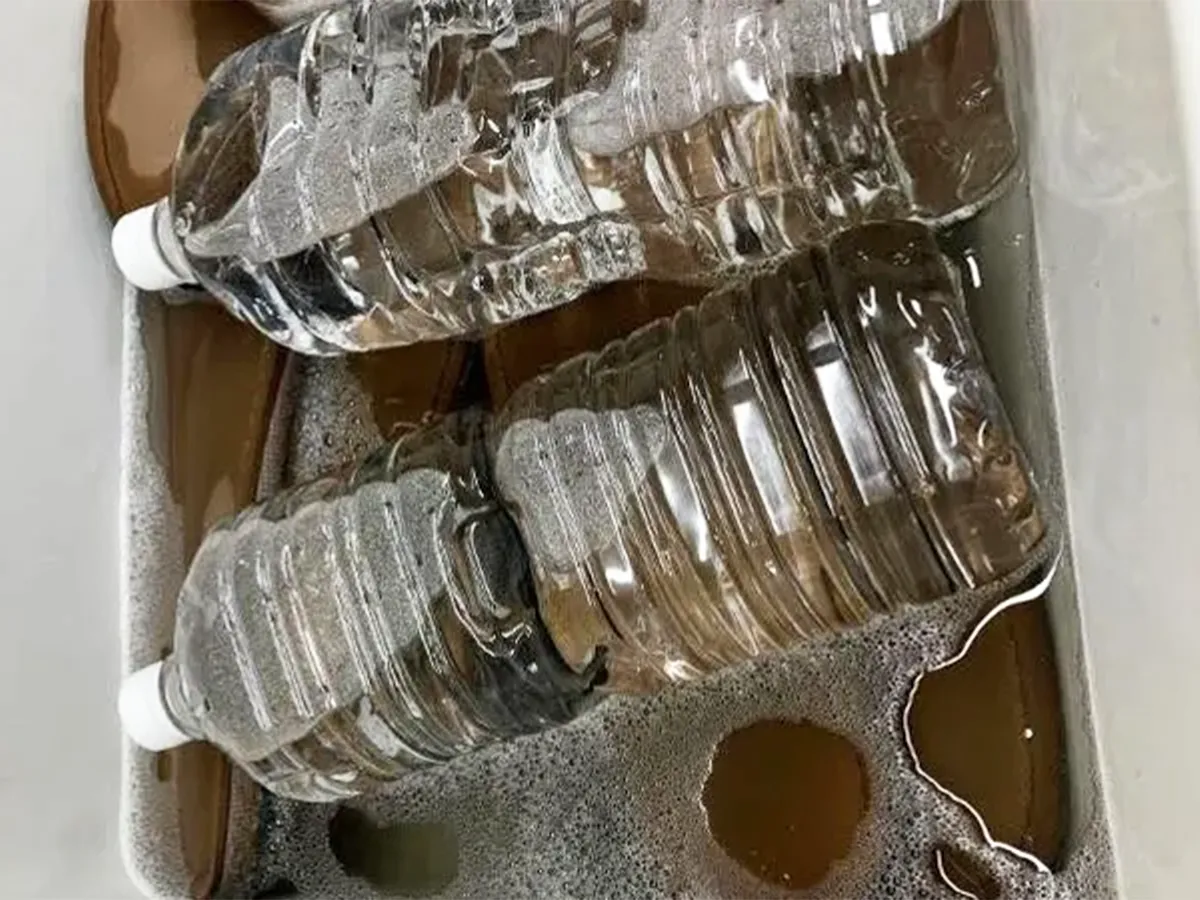 40℃のお湯に洗剤を溶かし、ペットボトルの重しをのせてスリッパを沈めてみると…。