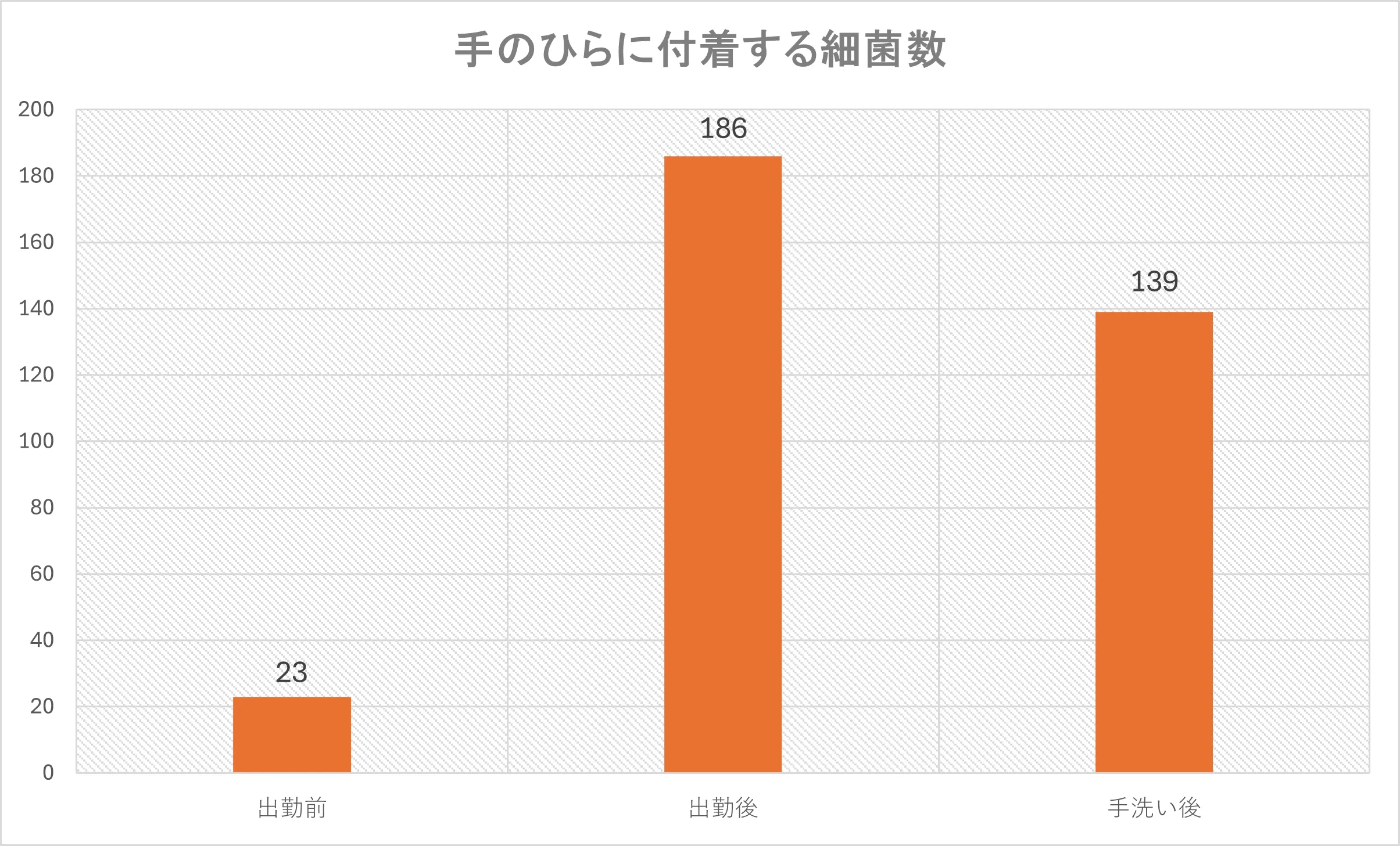 細菌数は出勤前の23(CFU=菌量の単位)から、出勤後は186(CFU)と増加。通勤途中に細菌が大量に手に付着していることが分かります。