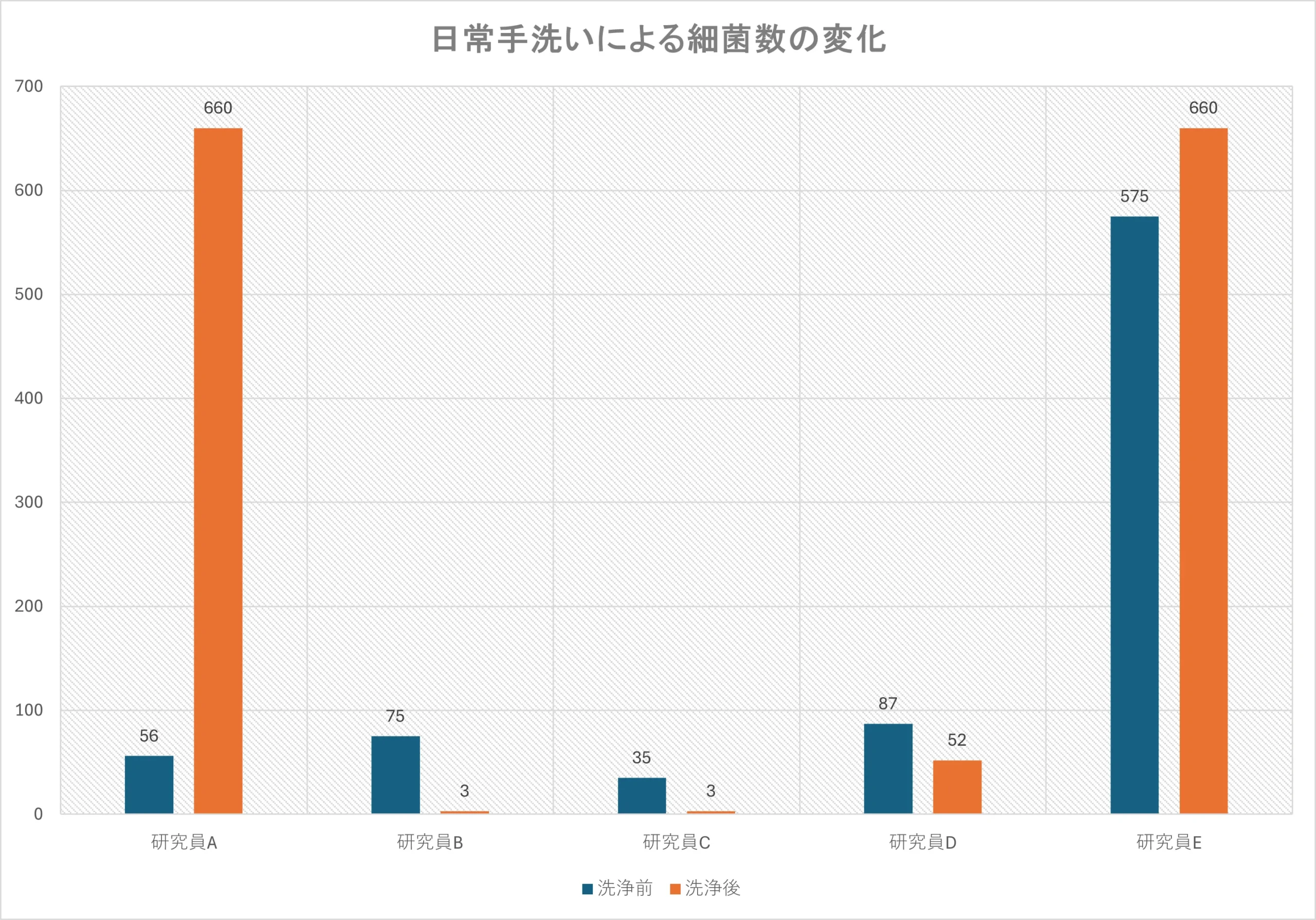 2人(A、E)は洗浄後の方が細菌数が多く、ほかの3人(B、C、D)も細菌はまだ残った状態でした。