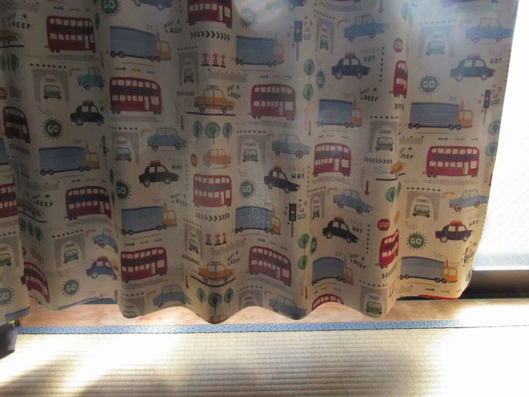 ズボラな私は必要な長さを測らずにカーテンを購入しまいました。 「確かこのくらいの長さだったような…」という記憶をもとに購入した既成のカーテンがこちらです。 だいぶ床から離れている感じがしますね。近寄ってみましょう。 長さ…