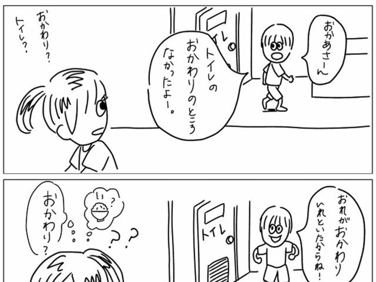 日常のワンシーンを、イラストにして、Instagramに投稿している、しーちゃん(tamakko0410)さん。 ある日、息子さんに「トイレのおかわりのところが、なかったよ~」といわれます。 投稿者さんは何のことだか、意…